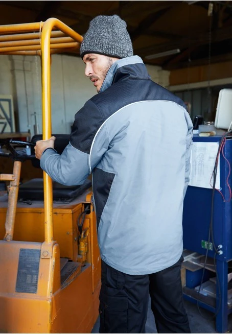 PU coated 100% polyamide oxford outer. Polyester padding and lining. Waterproof up to 3000 mm. Full front zip. Adjustable hem. 3 front zipped pockets. 2 inner pockets. Fleece lined collar. Reflective details front and back. Reinforcing textured panels at shoulders and sides. Zip access for decoration at chest and hem.