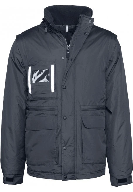 PVC coated 100% polyester ripstop outer. Polyester padding and lining inside. Fleece lined back and inner collar. Full front zip with studded flap. Detachable sleeves. 5 functional front pockets including one for badge holder. 1 inner pocket. Reflective trims on chest and back. Reinforcing shoulder panels. Side zip opening for ease of movement. Ajdustable drawcord at waist. Concealed hood. Zip access for decoration at chest and hem.