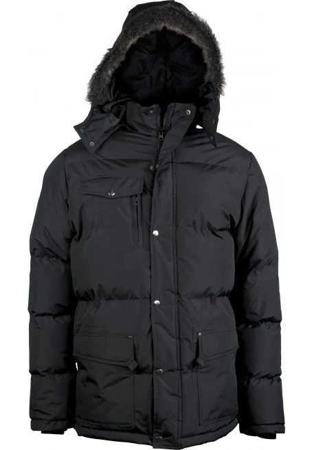 Outer: 100 % polyester pongee 230 g/m². Inner padding : 100 % polyester 135 g/m². Dual-fabric inner: microfleece 180 g/m² on upper body and quilted polyester lining 210T 60 g/m² on hem. Satin finish outer. 2 zipped pockets on the side and 1 zipped pocket on the front. 2 inner pockets. Ribbed inner collar and fleece lined removable hood. Two-way zip fastening with flap. Cuff with inner rib. Two-tone fancy inner band. 1 zip at chest and 1 zip at hem for decoration access.