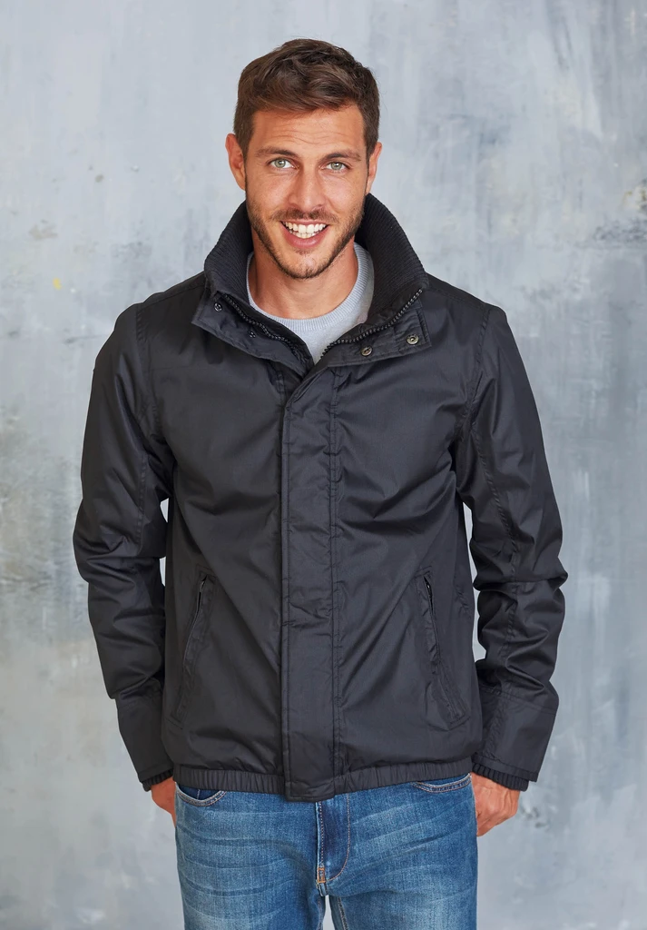 100% polyester baby ripstop with milky coating. 100% contrast Dark Grey polyester fleece lining. Full zip with studded storm flap. 3x3 ribbed inner collar. 2 front zipped and piped pockets. 1 inside pocket. 3x3 ribbed cuffs. Elasticated hem. Inner back and chest zip access for decoration.
