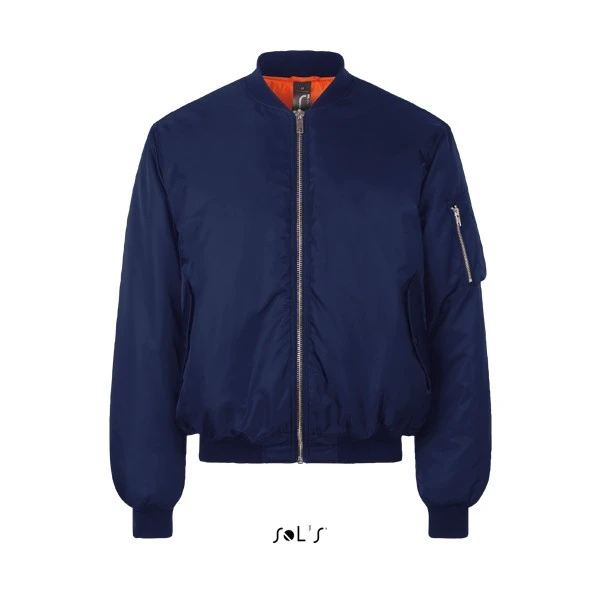 Lining and padding: 100% polyester; Zip opening, Ribbed collar, cuffs and bottom, 2 flap pocket with press studs, 1 zip pocket on sleeve, Contrast orange lining