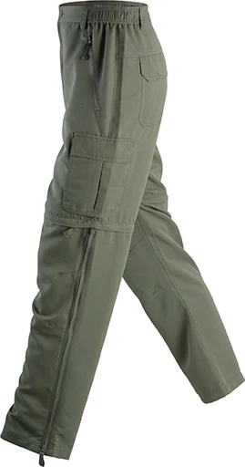 Vertical side zippers allow leg sections to be slipped off easily over footwear