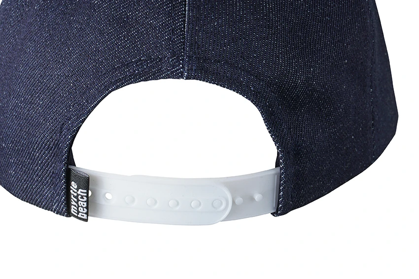Flat peak with 6 decorative stitching lines, Cap in hip jeans fabric, Flag-label on adjuster, Laminated front panels, 6 embroidered ventilation holes, Pleasant to wear due to padded sweatband, Size adjustment by fastener 'click & snap'