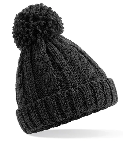 TearAway label for ease of rebranding, cuffed design for optimal decoration, heavyweight melange cable knit, hand-knitted feel, cotton Jersey lining for comfort and breathability, non-removable pom pom for added safety, self-coloured pom pom