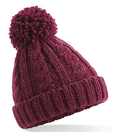 TearAway label for ease of rebranding, cuffed design for optimal decoration, heavyweight melange cable knit, hand-knitted feel, cotton Jersey lining for comfort and breathability, non-removable pom pom for added safety, self-coloured pom pom