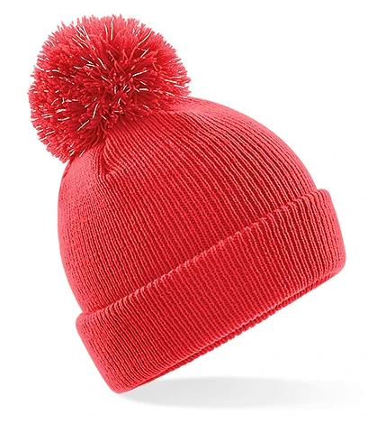 TearAway label for ease of rebranding, self-coloured pom pom with highly reflective fibres, unisex styling, cuffed design for optimal decoration, double layer knit