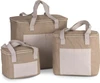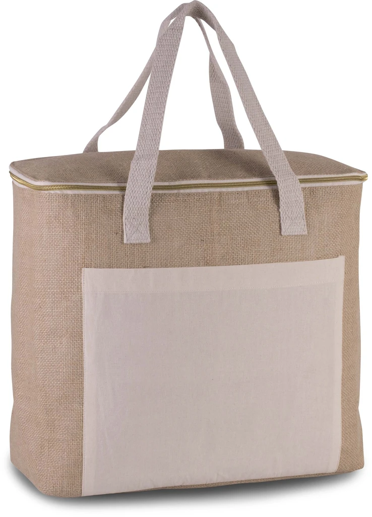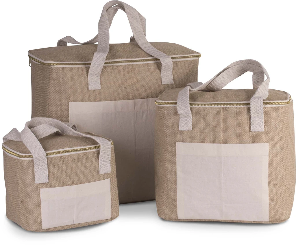 Cool bag with jute canvas outer and cotton pouch for easy decoration access. Inside cooler part with aluminium lining and high density insulating foam. Cotton handles. Large size.