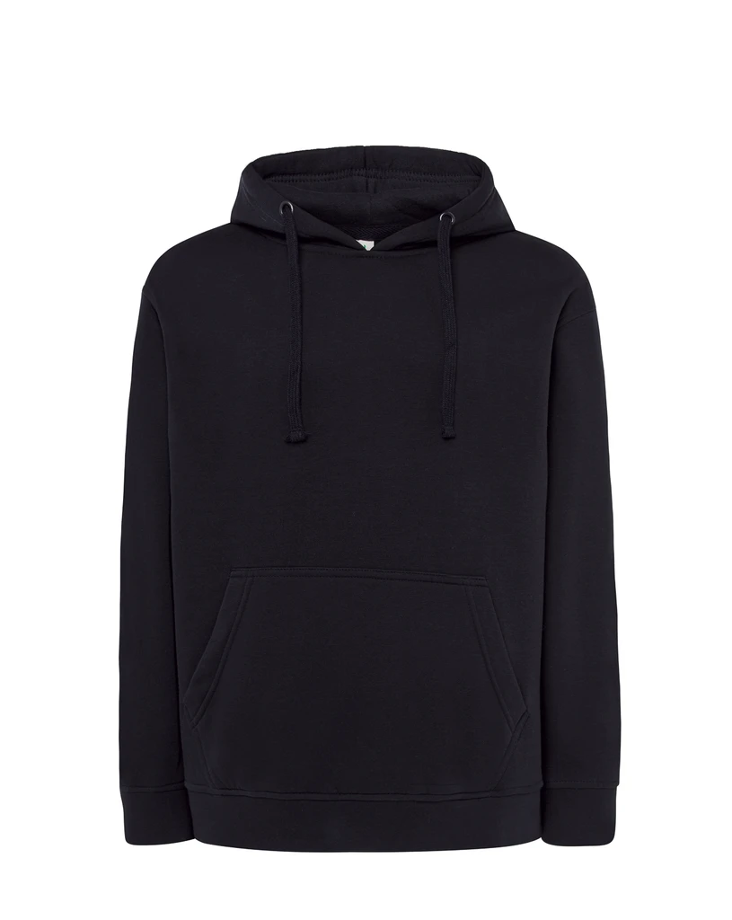 Hooded sweatshirt for men with kangaroo pocket and matching drawstring. Available in 29 colors and from size XS to 3 XL. Because of its higher polyester composition, some of our customers use the white sweatshirt to sublimate.
