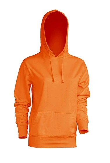 Hooded lady sweatshirt. Matched colour drawcord. Kangaroo pocket. 1x1 Rib with lycra in cuffs and waistband.