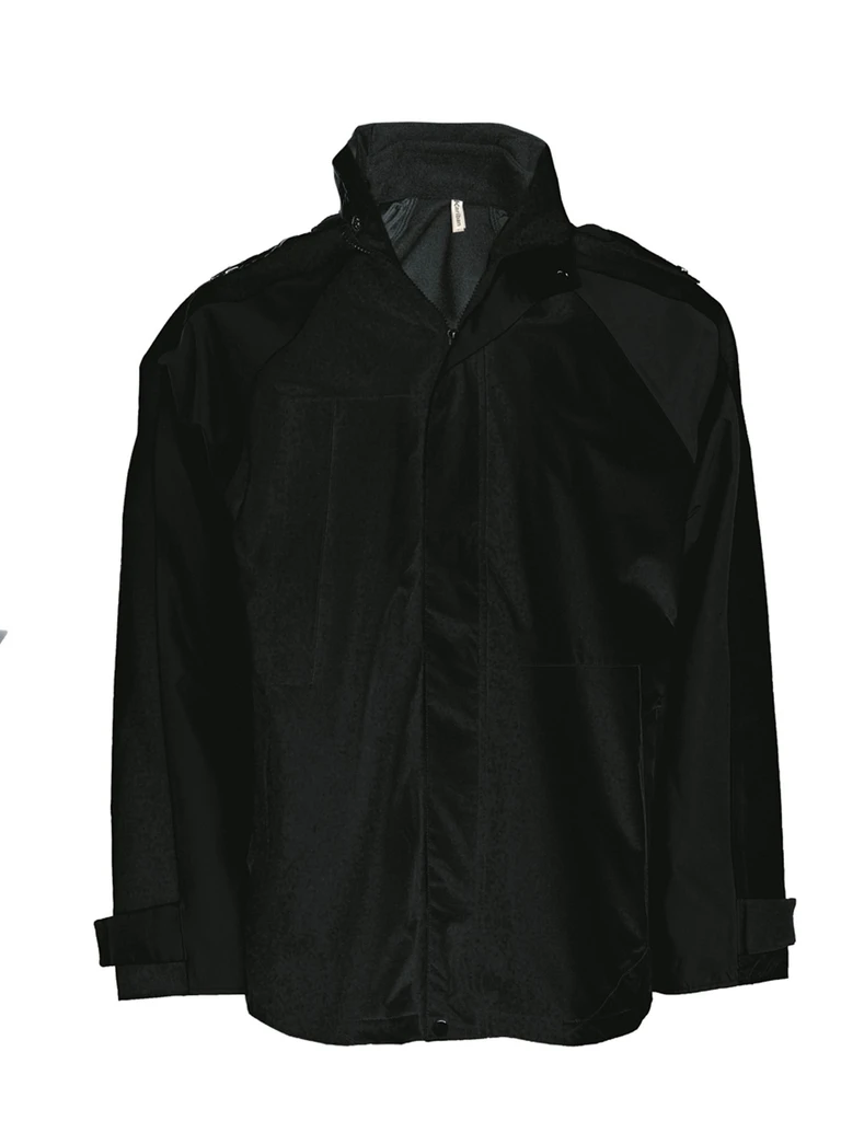 100 % Polyester outer with PVC coating, waterproof taped seams. Jacket: 100% polyester outer with pVc coating. Waterproof taped seams. 100 % polyester mesh lining for body & 100 % polyester sleeve lining. Detachable mesh lined hood with stud closing & toggles. Outdoor fleece lined collar. Full zip with studded storm flap. 4 front zip pockets with flap. Cuff adjusters with tear release fastening. Zip access for decoration. Outdoor Fleece Jacket: 100 % polyester micro fleece. 100% polyester sleeve lining for easy arm slip-in. Full length zip. 2 side pockets. Zip-in Zip-out system to attach to outer parka jacket.
