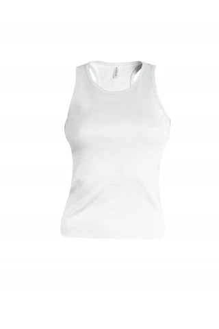 100% cotton 1 x 1 rib. Racer back style. Deep hem. Twin needle finishing.