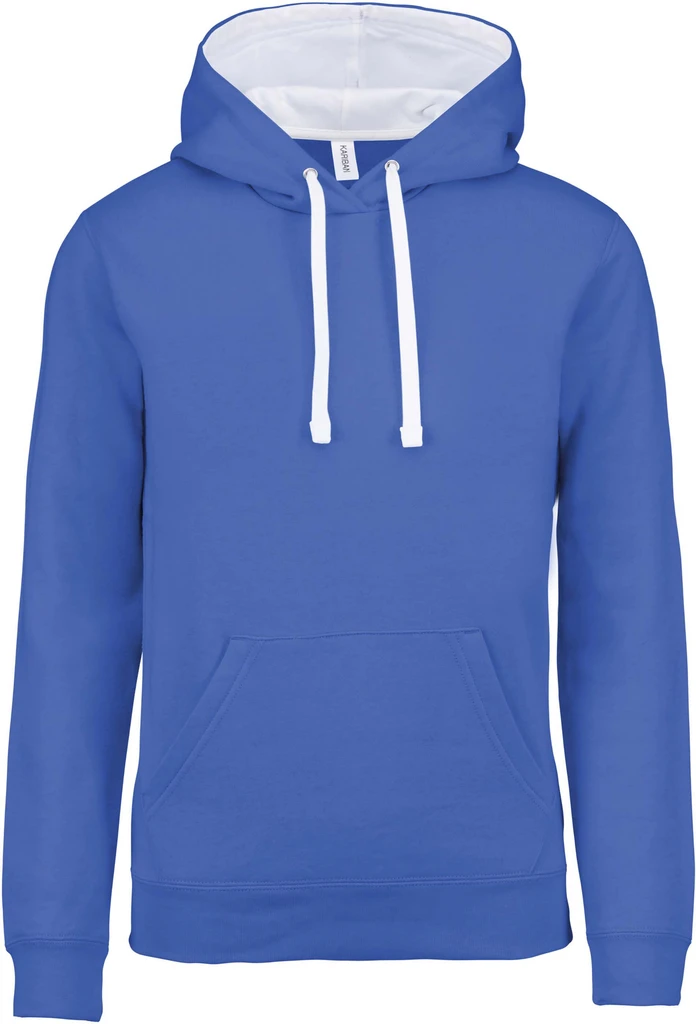 80% combed cotton / 20% polyester. Brushed fleece. Kangaroo pocket with earphones access. Ribbed cuffs and waistband. Contrast lined hood with drawcord.
