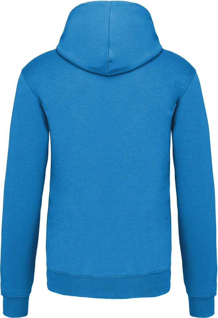 80% combed cotton / 20% polyester. Brushed fleece. Kangaroo pocket with earphones access. Ribbed cuffs and waistband. Contrast lined hood with drawcord.