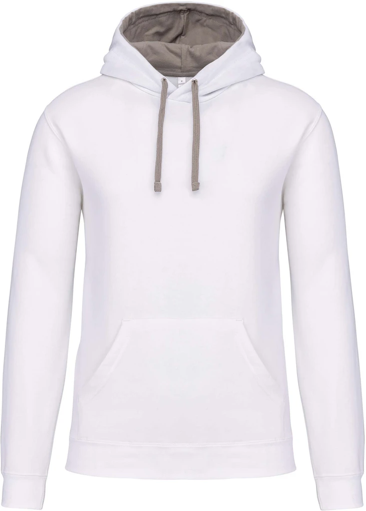 80% combed cotton / 20% polyester. Brushed fleece. Kangaroo pocket with earphones access. Ribbed cuffs and waistband. Contrast lined hood with drawcord.