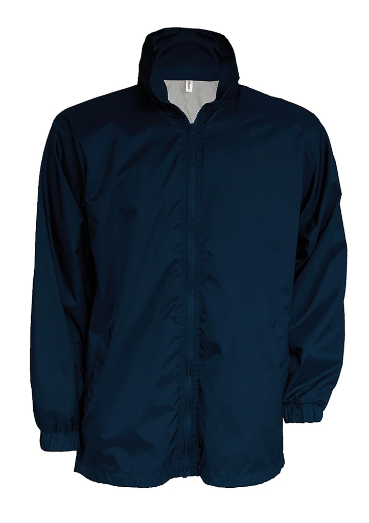100 % Polyamide 210 T with acrylic coating. Polyester marl grey jersey lining. Concealed hood with elastic drawcord. Zip through front. 1 inner pocket and 2 front pockets. Elasticated drawcord with toggles at hem. Zip access for decoration.