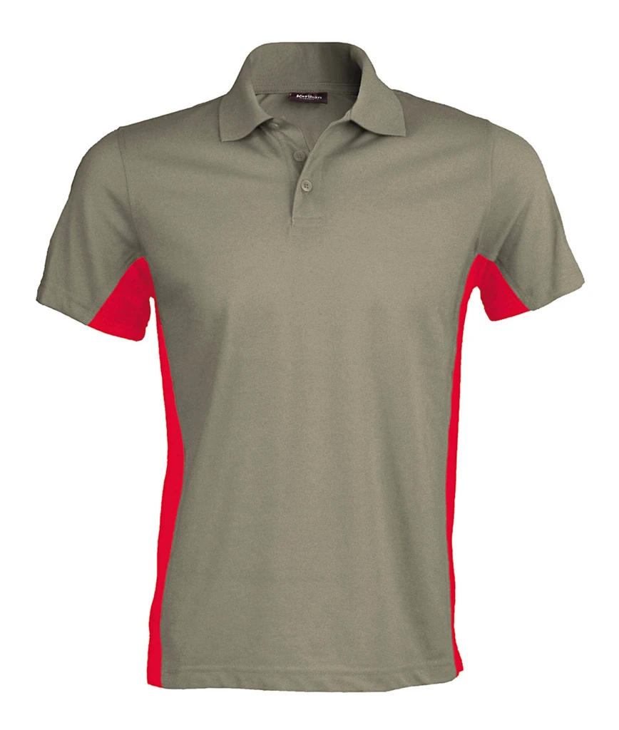 65 % Polyester 35 % Cotton, Piqué Knit. Flat knit collar with taped neck. 3-button placket. Contrast panels down arm and body sides. Hemmed sleeves. Side vents. Twin needle finishing.