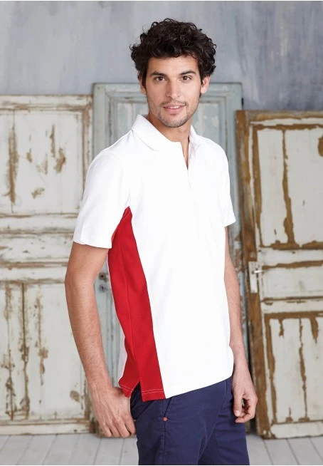 65 % Polyester 35 % Cotton, Piqué Knit. Flat knit collar with taped neck. 3-button placket. Contrast panels down arm and body sides. Hemmed sleeves. Side vents. Twin needle finishing.