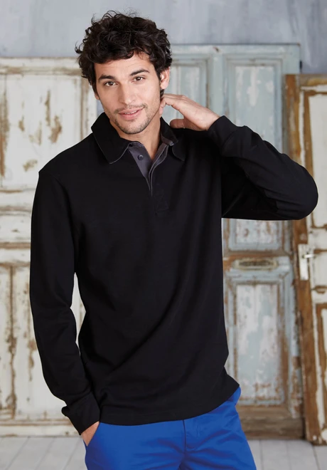 100 % Cotton rib (85 % cotton 15 % viscose for Grey). Contrast chevron taped neck and side vents. Concealed 3-button placket. Contrast collar reverse and inner placket. Locker patch. Cuffed sleeves. Twin needle finishing.
