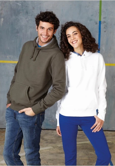 80 % Ringspun Cotton 20 % Polyester. Low shrinkage brushed fleece. Silicone wash. Heather grey contrast reinforced neck tape and inner hood for all colours, except for oxford grey body where reinforced neck tape and inner hood are dark grey. Set-in sleeves. Front kangaroo pouch pocket. Ribbed cuffs and waistband.