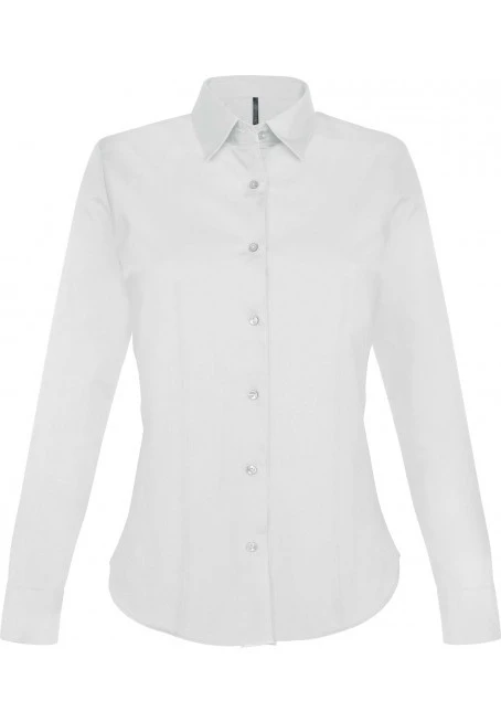 97% Cotton / 3% Elastane. Feminine style. Soft collar. Self coloured buttons. Front and back darts for ultimate confort. Angle cut adjustable cuff. 1 spare button. Shaped hem.