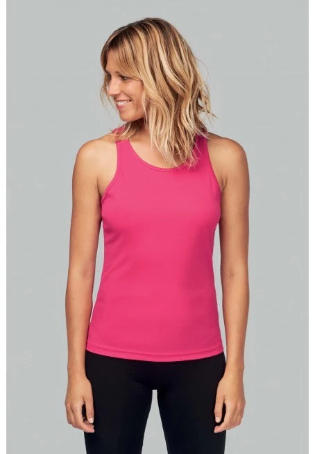 100% Polyester. Quick drying light weight fabric. Racer back style. Self fabric bound neck and armholes. Twin needle finishing.