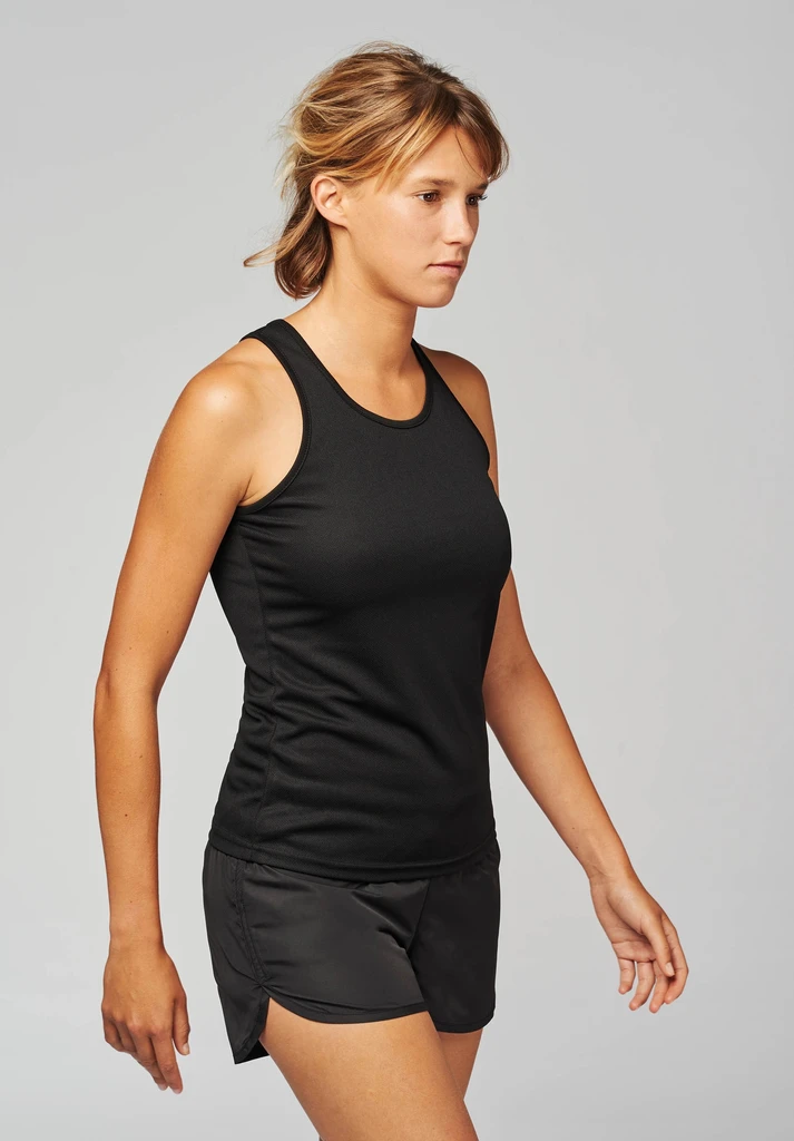 100% Polyester. Quick drying light weight fabric. Racer back style. Self fabric bound neck and armholes. Twin needle finishing.