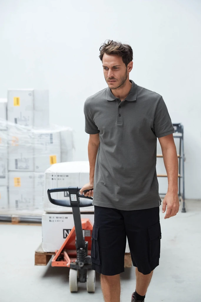 100 % Cotton Pique - washable at 60° (Oxford Grey : 90% Cotton / 10% Viscose - washable at 40°). Flat knit rib. Oxford grey contrast taped neck & side slits for all colours, except for oxford grey body where tape neck is dark grey. 3 button placket. Elastane reinforced ribbed cuffs. Twin needle finishing.
