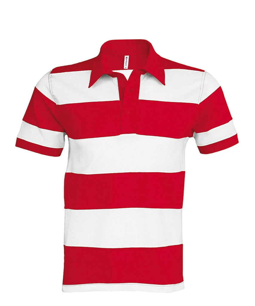 100 % Cotton Jersey, soft touch. Broad bi-colour sewn stripes. Shirt style collar. 3-button placket. Cuffed sleeves. Chevron taped neck and side vents. Twin needle hem.