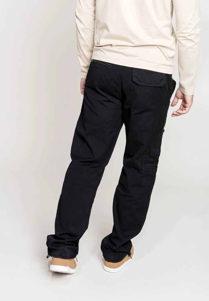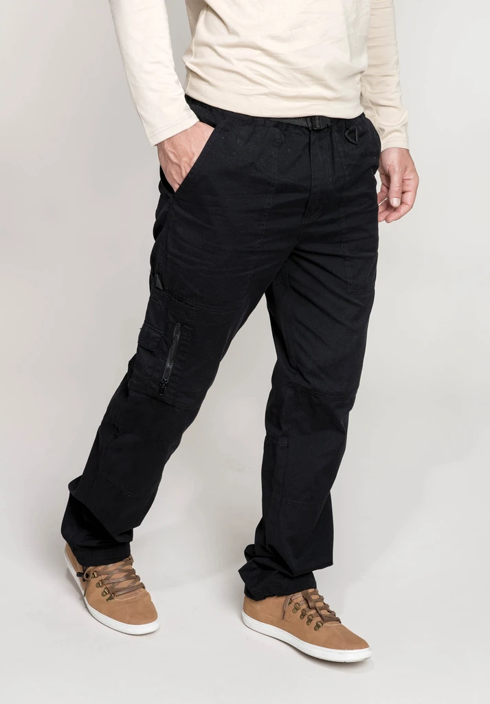 100 % Cotton washed canvas. Elasticated waist with zip fly and button. Adjustable clip belt - 2 side pockets. 2 back pockets, 1 zip, 1 tear release fastening. Left leg zip pocket. Right leg multi-pockets, 2 tear release fastening sections and 1 zip section. Drawcord and toggle at leg ends.