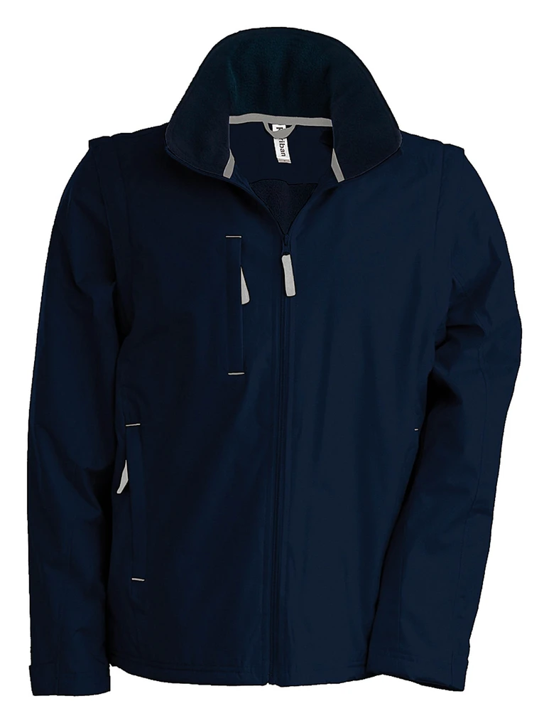 100 % Polyester with PVC coating. Comfortable fabric. Polyester outdoor fleece lining. Polyester padding and lining. Zip through front. 3 front zip closing pockets. Detachable sleeves. Adjustable cuffs. Contrast zip pullers, inner collar tape & bartacks. Inside 2 zip closing pockets & 1 mobile phone pocket. Concealed hood. Contrast elasticated drawcord with toggles at hem. Zip access for decoration.