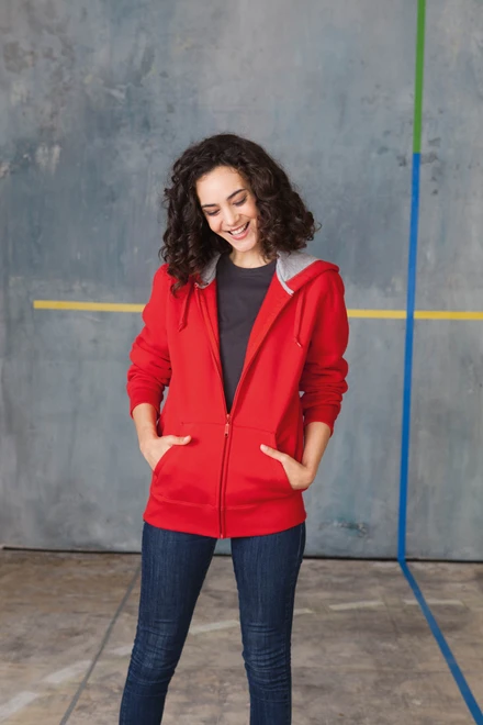 80% combed cotton / 20% polyester. Low shrinkage brushed fleece. Silicone wash. Heather grey contrast reinforced neck tape and inner hood for all colours, except for oxford grey body where reinforced neck tape and inner hood are dark grey. Set-in sleeves. Front pouch pockets. Ribbed cuffs and waistband. YKK® zip.