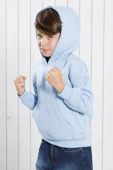 Unisex Kids hooded sweatshirt. Kangaroo pocket. 1x1 Rib with lycra in cuffs and waistband.