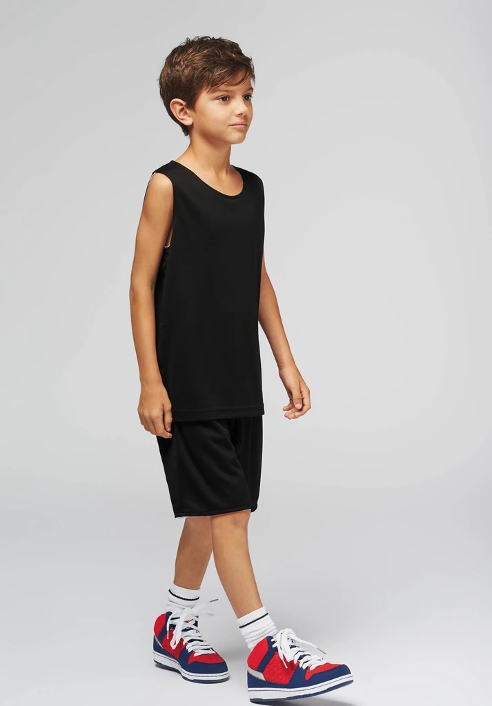 100 % polyester. Quick-drying, lined and reversible fabric. Unisex kit including sleeveless vest and shorts. Vest : reversible, 2 stitched layers of 140 g/m² each. Unfinished hem for easy decoration access. Shorts : reversible, 2 stitched layers of 140 g/m² each. Elasticated waist with drawstring.