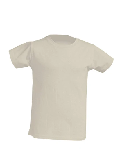 Kids short sleeve T-shirt. Side seams on body. Lycra rib neck. Double stitch on collar, sleeves and bottom. Shoulder to shoulder tape. Grey Melange: 85% cotton / 15% polyester.