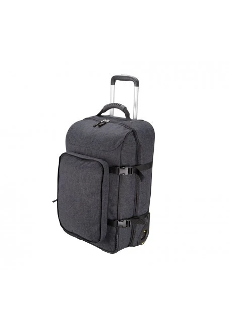 Kimood JAP cabin size trolley suitcase, in twisted 600D HD, PU backing, removable front pocket panel for easier printing or embroidery, design silicon wheel in contrast color, two separate inner compartments, rubber handle. SBS zips.