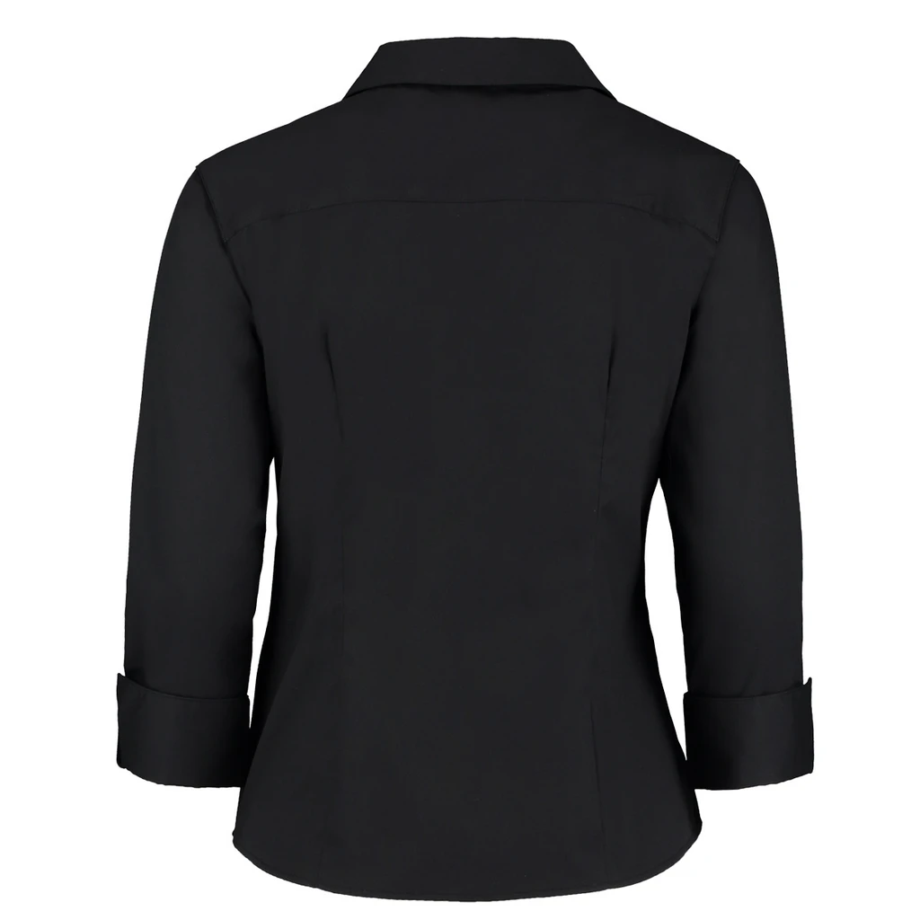 125 gsm • 85 % cotton, 15 % polyester • easy iron Oxford blouse • tone-on-tone buttons • buttonless placket at neckline • 3/4 sleeves with vented cuffs • 2 back darts and 2 front darts for a fitted waist • seam across back • slightly rounded bottom hem.