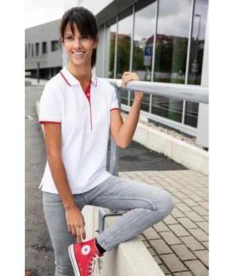 Knitted polo collar and sleeve cuffs with contrasting stripe