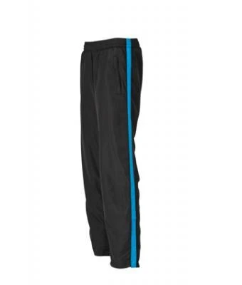 Light-weight fabric, wind- and water-repellent, breathable, Full-length mesh lining, Lateral contrasting stripes, 2 zipped pockets, Elastic waistband with cord, Zipped leg gathers, Reflective transfer