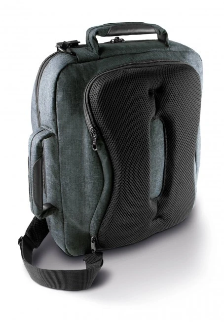 Computer / document bag convertible into a backpack in 600D polyester PU backing. Hidden detachable and adjustable shoulder straps and padded mesh back, bottom zip to hang to a trolley system. Double padded reinforced handle, front organizing pocket, fully padded main compartment for laptop up to 15", headphone hole and key holder.
