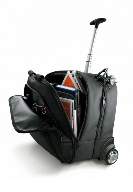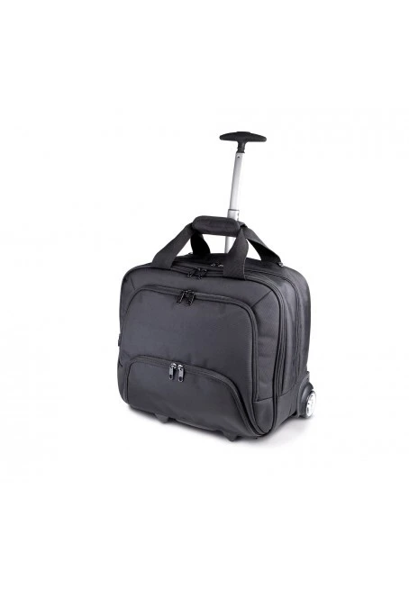 Laptop trolley in 1680D, PU backing, curved handle in anodized aluminum, 2 main compartments, one with computer holder up to 17" , one large for documents and clothes for overnight trip, 2 front pocket one organized one for laptop accessories, key holder, trolley belt on the back, SBS zips.