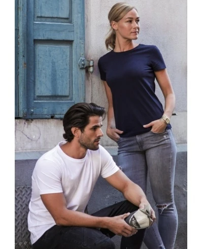 Weight: 160 gsm (White: 155 gsm); Composition: 100% Cotton (Organic), combed and ring-spun (Light Oxford: 97% Cotton, 3% Viscose); Single Jersey, Smooth surface for best print results, Narrow collar band with Elastane, Shoulder-to-shoulder tape, Labelfree, Side seams, Contemporary shaped fit; Certificates: OEKO-TEX® STANDARD 100, GOTS - Global Organic Textile Standard, WRAP