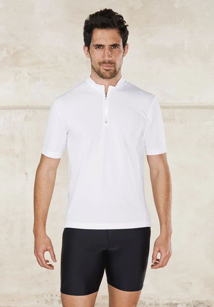 100 % polyester. Quick drying light weight fabric. Mockneck with reflective zip. Drop back hem. Rear pocket with reflective zip and headphone access.