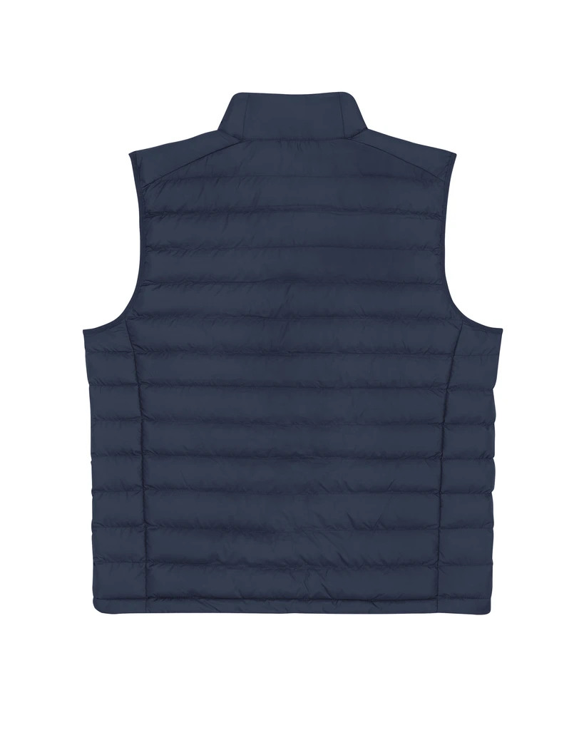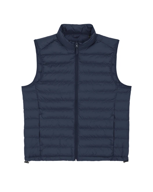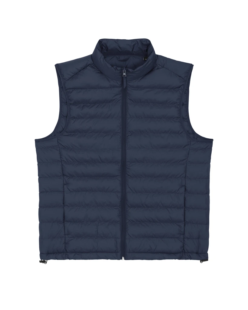 Material: 100% Recycled polyester , Fluorine-free DWR; Weight: 75gsm; Fitted, sleeveless, high collar, reverse nylon zip at center front, zipped welt pockets with extra grosgrain puller, elastic tape binding at armhole, fully quilted, side panels for better shape, inside bound seams, bottom hem with adjustable plastic stopper and elastic cord; Certificates: Global Recycled Standard (GRS), Fair Wair, STANDARD 100 by OEKO-TEX®, Peta - Approved VEGAN
