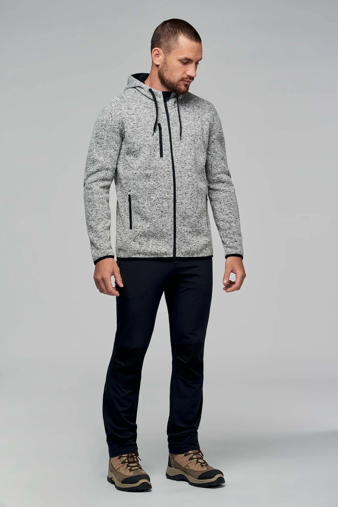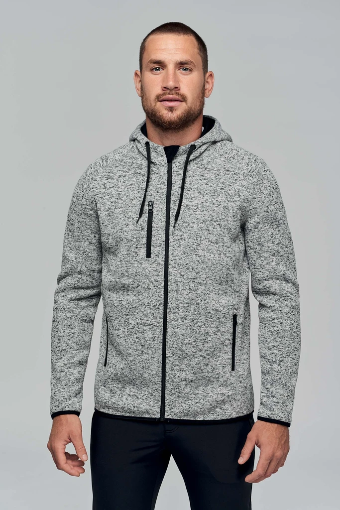 Inner brushed knit in 100 % polyester. 2 contrasting zipped front pockets and 1 contrasting zipped chest pocket. Hood with contrasting 100 % cotton jersey lining and flat contrasting drawstring. Cuffs and hem with contrasting elasticated binding. Coverstitching on panels.