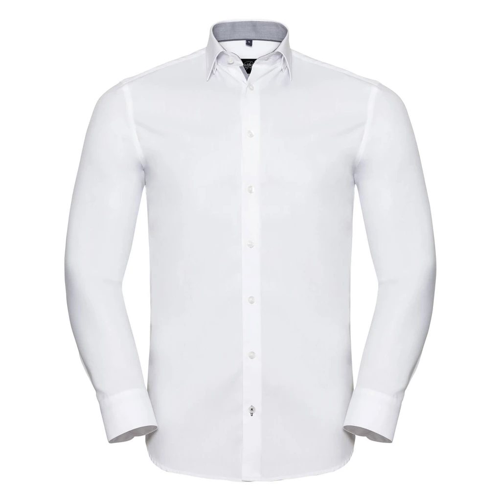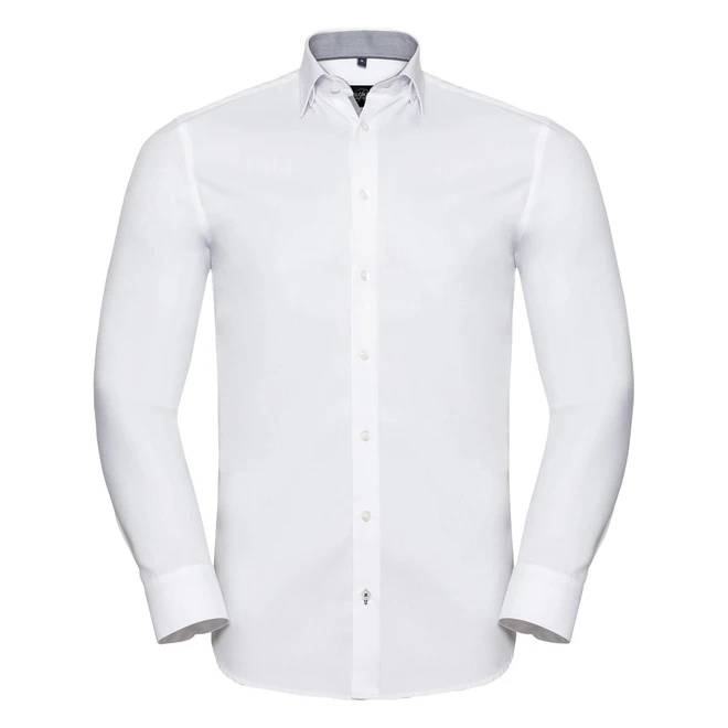 Weight: 130gsm (White: 125gsm); Material: 84% Cotton, 16% Polyester; Men's LS Tailored Contrast Herringbone Shirt; Under button down collar, Contrast colours inside collar and cuffs with contrast piping, Contrast edging around lower button placket, Darts at back, Curved hem, Rounded 2 button adjustable cuffs (with cuff link option), Easy Care, Tailored fit; Certificates: STANDARD 100 by OEKO-TEX®; WRAP