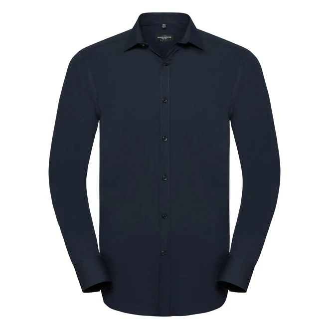 Weight: 130gsm (White: 125gsm); Material: 75% cotton, 25% elastomultiester (LYCRA® T400® fibre) Poplin; Excellent shape retention for a lasting fit, Durable fabric with moisture management for cool comfort, Short leaf, semi cutaway collar, Narrow placket, Square edged cuffs (cuff link option), Darts at back, Fitted fit; Certificates: STANDARD 100 by OEKO-TEX®; WRAP