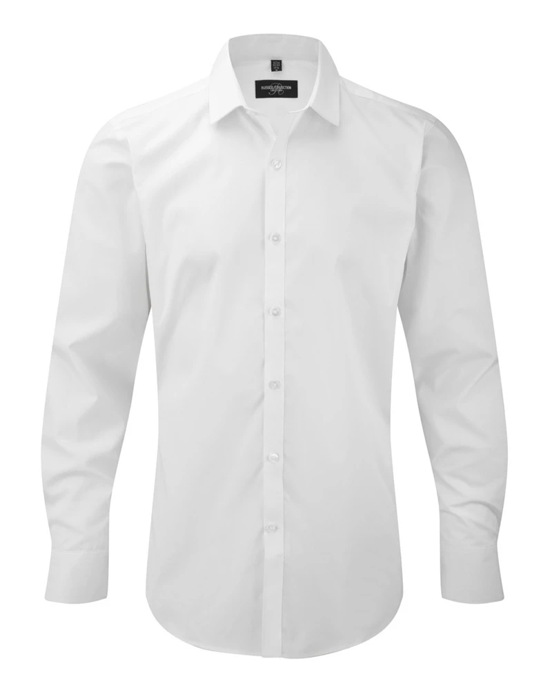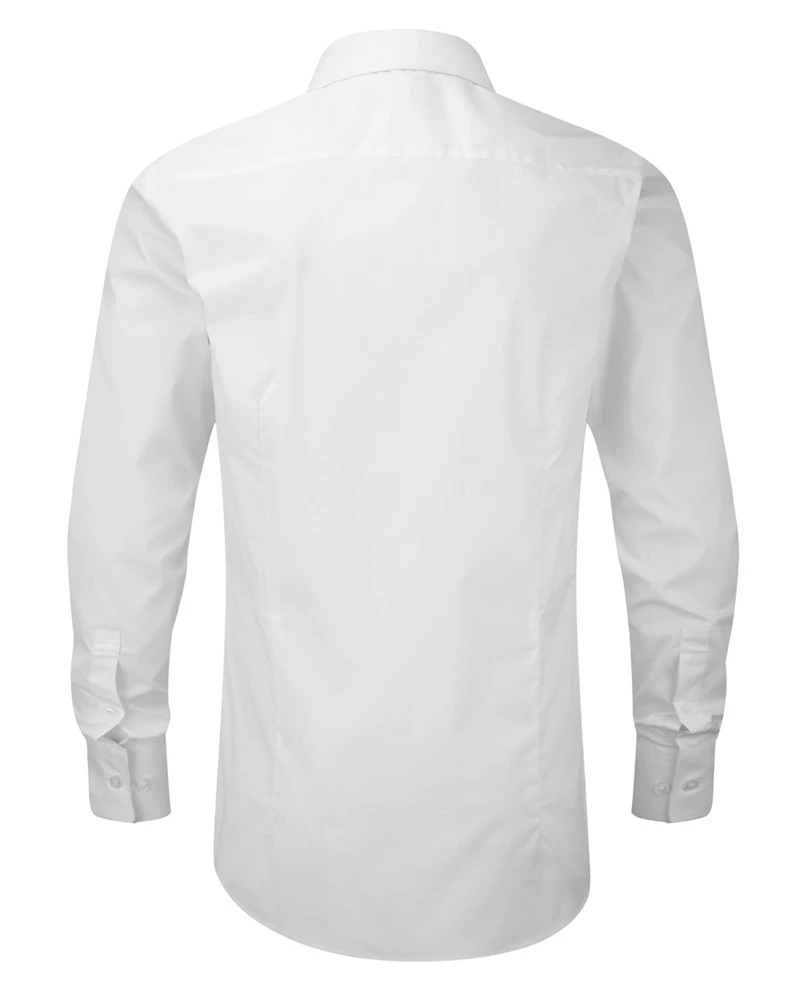 Weight: 130gsm (White: 125gsm); Material: 75% cotton, 25% elastomultiester (LYCRA® T400® fibre) Poplin; Excellent shape retention for a lasting fit, Durable fabric with moisture management for cool comfort, Short leaf, semi cutaway collar, Narrow placket, Square edged cuffs (cuff link option), Darts at back, Fitted fit; Certificates: STANDARD 100 by OEKO-TEX®; WRAP