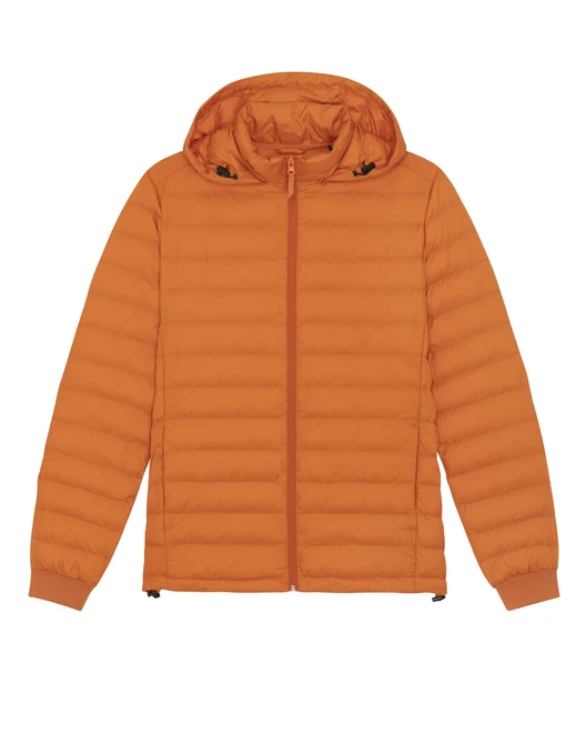Material: 100% Recycled polyester, Fluorine-free DWR; Weight: 75gsm; Fitted cut, set-in sleeve, high collar with detachable hood and matte metal hidden snaps, hood opening and bottom hem with adjustable plastic stopper and elastic cord, reverse nylon zip at center front, zipped welt pockets with extra grosgrain puller, fully quilted, side panels for better shape, 1x1 rib at sleeve hem, inside bound seams; Certificates: Global Recycled Standard (GRS), Fair Wair, STANDARD 100 by OEKO-TEX®, Peta - Approved VEGAN