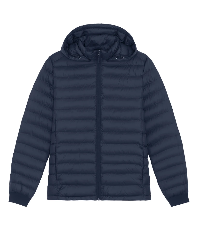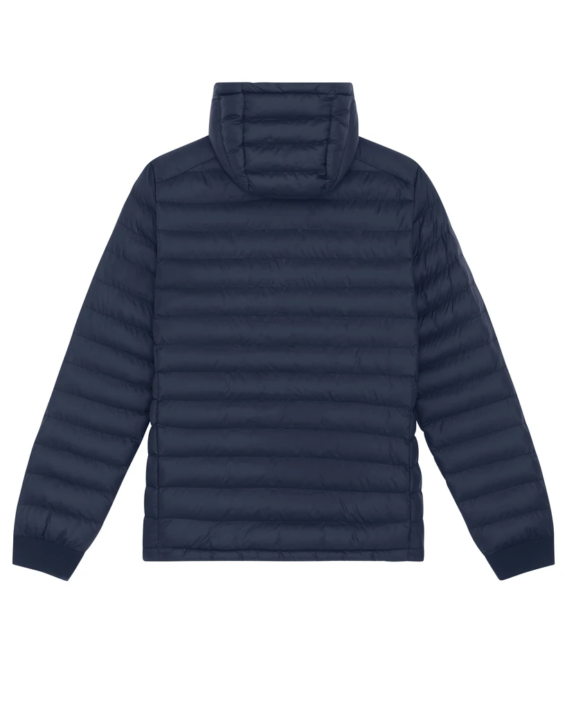 Material: 100% Recycled polyester, Fluorine-free DWR; Weight: 75gsm; Fitted cut, set-in sleeve, high collar with detachable hood and matte metal hidden snaps, hood opening and bottom hem with adjustable plastic stopper and elastic cord, reverse nylon zip at center front, zipped welt pockets with extra grosgrain puller, fully quilted, side panels for better shape, 1x1 rib at sleeve hem, inside bound seams; Certificates: Global Recycled Standard (GRS), Fair Wair, STANDARD 100 by OEKO-TEX®, Peta - Approved VEGAN