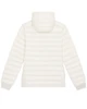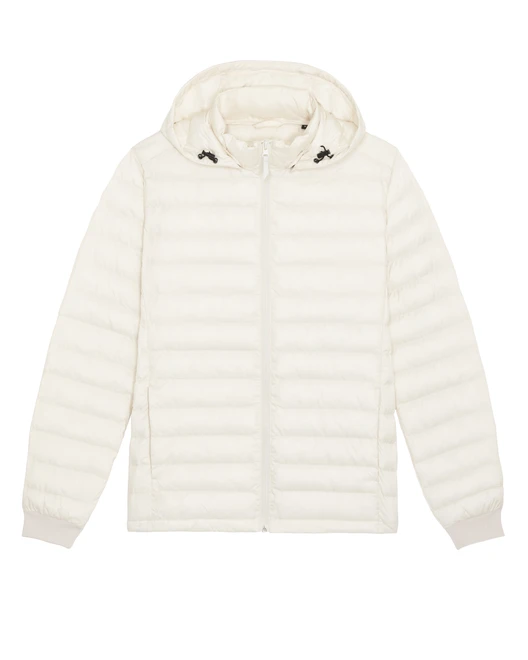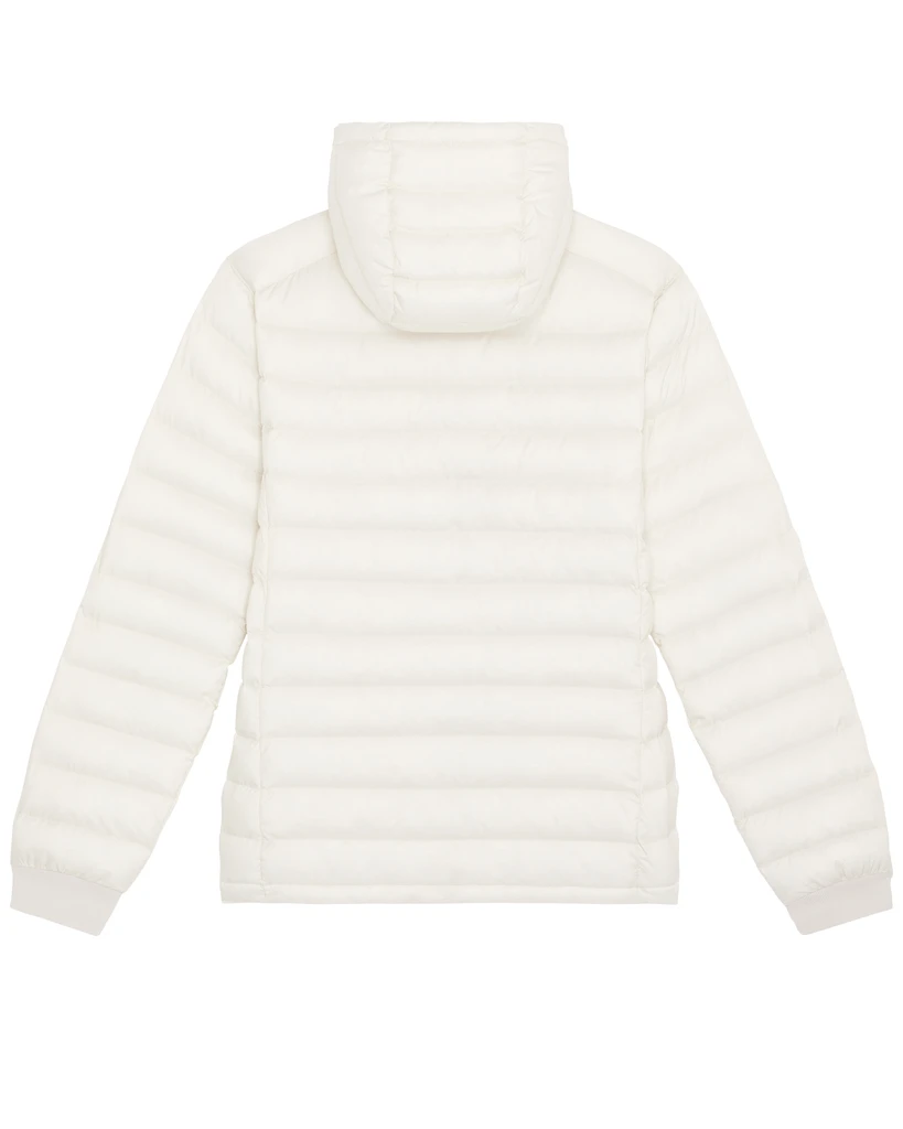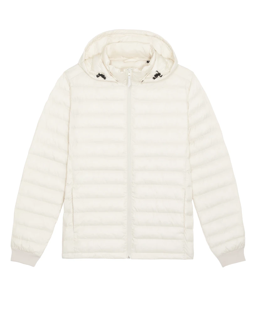 Material: 100% Recycled polyester, Fluorine-free DWR; Weight: 75gsm; Fitted cut, set-in sleeve, high collar with detachable hood and matte metal hidden snaps, hood opening and bottom hem with adjustable plastic stopper and elastic cord, reverse nylon zip at center front, zipped welt pockets with extra grosgrain puller, fully quilted, side panels for better shape, 1x1 rib at sleeve hem, inside bound seams; Certificates: Global Recycled Standard (GRS), Fair Wair, STANDARD 100 by OEKO-TEX®, Peta - Approved VEGAN